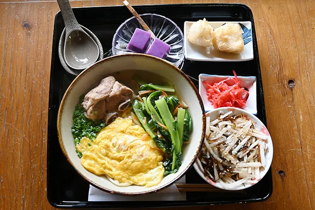 築90年の古民家で、仏壇があり、いまでも法事の際は、お店を閉めて親戚の方々が集います。 島では「かじまやー」という97歳の長寿祝いを地元の方皆で行います。 通年、沖縄そば膳のみのメニューです。中身そば、塩ソーキそば、醤油そばの3種類から選べます。
